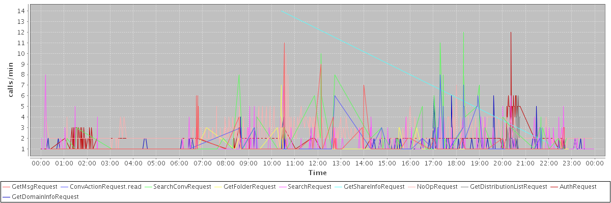 max(GetMsgRequest) = 11.00 max(ConvActionRequest.read) = 8.00 max(SearchConvRequest) = 12.00 max(GetFolderRequest) = 7.00 max(SearchRequest) = 8.00 max(GetShareInfoRequest) = 14.00 max(NoOpRequest) = 10.00 max(GetDistributionListRequest) = 6.00 max(AuthRequest) = 12.00 max(GetDomainInfoRequest) = 6.00