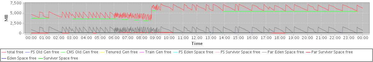 avg(total free) = 5671.44 avg(PS Old Gen free) = 0.00 avg(CMS Old Gen free) = 4749.67 avg(Tenured Gen free) = 0.00 avg(Train Gen free) = 0.00 avg(PS Eden Space free) = 0.00 avg(PS Survivor Space free) = 0.00 avg(Par Eden Space free) = 801.56 avg(Par Survivor Space free) = 120.21 avg(Eden Space free) = 0.00 avg(Survivor Space free) = 0.00