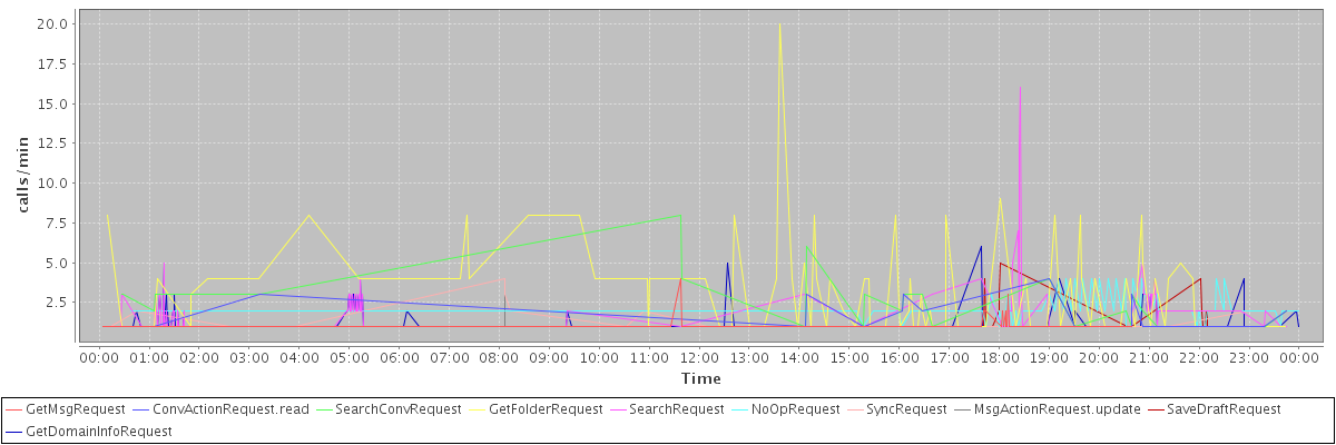 max(GetMsgRequest) = 4.00 max(ConvActionRequest.read) = 4.00 max(SearchConvRequest) = 8.00 max(GetFolderRequest) = 20.00 max(SearchRequest) = 16.00 max(NoOpRequest) = 4.00 max(SyncRequest) = 4.00 max(MsgActionRequest.update) = 3.00 max(SaveDraftRequest) = 5.00 max(GetDomainInfoRequest) = 6.00