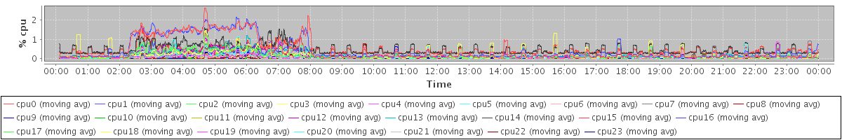 avg(cpu0) = 0.42 avg(cpu1) = 0.43 avg(cpu2) = 0.14 avg(cpu3) = 0.18 avg(cpu4) = 0.09 avg(cpu5) = 0.10 avg(cpu6) = 0.06 avg(cpu7) = 0.08 avg(cpu8) = 0.05 avg(cpu9) = 0.04 avg(cpu10) = 0.04 avg(cpu11) = 0.05 avg(cpu12) = 0.17 avg(cpu13) = 0.19 avg(cpu14) = 0.47 avg(cpu15) = 0.42 avg(cpu16) = 0.13 avg(cpu17) = 0.14 avg(cpu18) = 0.05 avg(cpu19) = 0.06 avg(cpu20) = 0.05 avg(cpu21) = 0.06 avg(cpu22) = 0.03 avg(cpu23) = 0.05