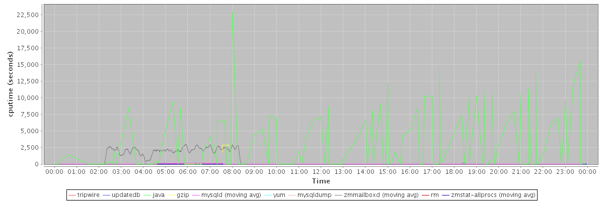 avg(tripwire) = 1890.00 avg(updatedb) = 42.33 avg(java) = 1984.13 avg(gzip) = 2857.84 avg(mysqld) = 27.45 avg(yum) = 1154.00 avg(mysqldump) = 138.74 avg(zmmailboxd) = 550.49 avg(rm) = 12.00 avg(zmstat-allprocs) = 11.56