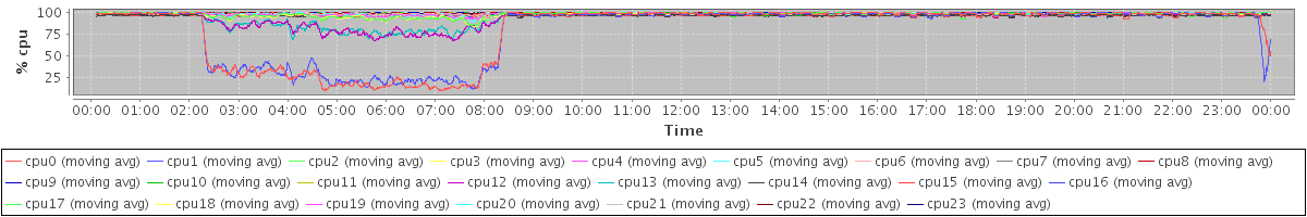 avg(cpu0) = 8.01 avg(cpu1) = 8.11 avg(cpu2) = 1.01 avg(cpu3) = 1.07 avg(cpu4) = 0.67 avg(cpu5) = 0.59 avg(cpu6) = 0.35 avg(cpu7) = 0.43 avg(cpu8) = 0.25 avg(cpu9) = 0.25 avg(cpu10) = 0.24 avg(cpu11) = 0.22 avg(cpu12) = 1.52 avg(cpu13) = 1.45 avg(cpu14) = 2.56 avg(cpu15) = 2.59 avg(cpu16) = 1.06 avg(cpu17) = 1.19 avg(cpu18) = 0.44 avg(cpu19) = 0.49 avg(cpu20) = 0.27 avg(cpu21) = 0.37 avg(cpu22) = 0.22 avg(cpu23) = 0.34