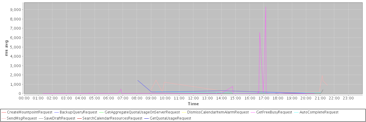 avg(CreateMountpointRequest) = 80.00 avg(BackupQueryRequest) = 432.80 avg(GetAggregateQuotaUsageOnServerRequest) = 898.00 avg(DismissCalendarItemAlarmRequest) = 141.00 avg(GetFreeBusyRequest) = 249.81 avg(AutoCompleteRequest) = 103.71 avg(SendMsgRequest) = 680.62 avg(SaveDraftRequest) = 77.04 avg(SearchCalendarResourcesRequest) = 82.00 avg(GetQuotaUsageRequest) = 1042.00