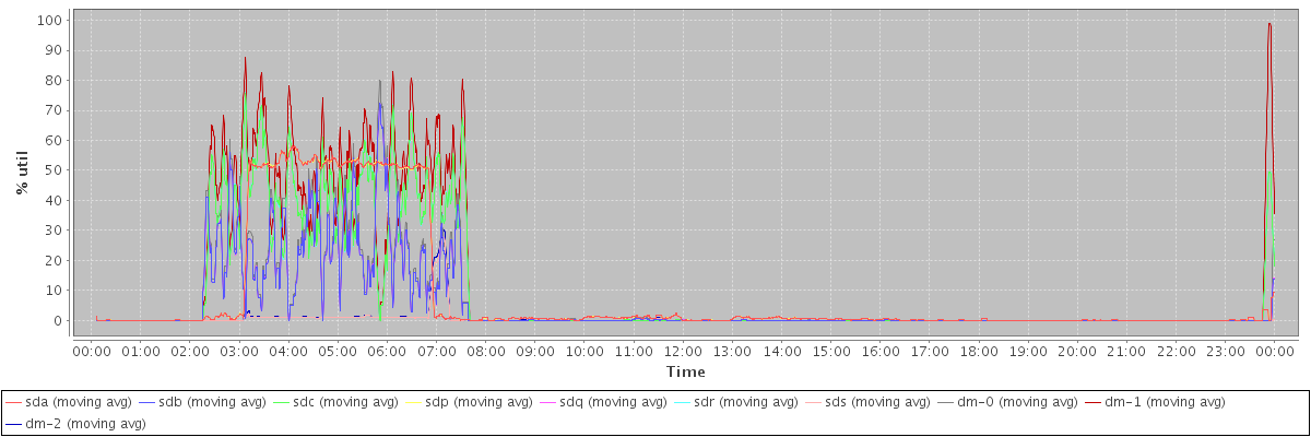 avg(sda) = 8.63 avg(sdb) = 5.54 avg(sdc) = 9.54 avg(sdp) = 8.64 avg(sdq) = 5.55 avg(sdr) = 9.54 avg(sds) = 0.50 avg(dm-0) = 6.11 avg(dm-1) = 11.73 avg(dm-2) = 0.58