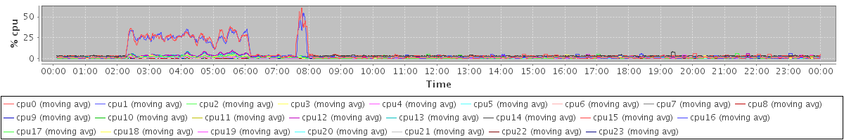 avg(cpu0) = 5.72 avg(cpu1) = 5.42 avg(cpu2) = 0.65 avg(cpu3) = 0.72 avg(cpu4) = 0.43 avg(cpu5) = 0.39 avg(cpu6) = 0.23 avg(cpu7) = 0.31 avg(cpu8) = 0.13 avg(cpu9) = 0.15 avg(cpu10) = 0.13 avg(cpu11) = 0.14 avg(cpu12) = 1.12 avg(cpu13) = 1.05 avg(cpu14) = 2.58 avg(cpu15) = 2.60 avg(cpu16) = 0.99 avg(cpu17) = 1.03 avg(cpu18) = 0.38 avg(cpu19) = 0.38 avg(cpu20) = 0.16 avg(cpu21) = 0.25 avg(cpu22) = 0.11 avg(cpu23) = 0.22
