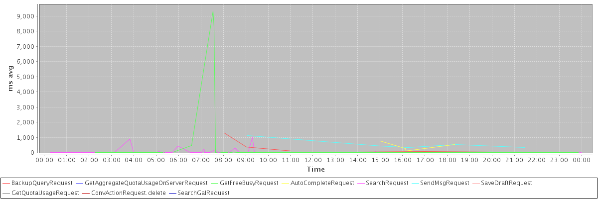 avg(BackupQueryRequest) = 382.40 avg(GetAggregateQuotaUsageOnServerRequest) = 1023.00 avg(GetFreeBusyRequest) = 392.21 avg(AutoCompleteRequest) = 429.75 avg(SearchRequest) = 49.15 avg(SendMsgRequest) = 561.60 avg(SaveDraftRequest) = 37.30 avg(GetQuotaUsageRequest) = 1028.00 avg(ConvActionRequest.delete) = 211.00 avg(SearchGalRequest) = 74.00