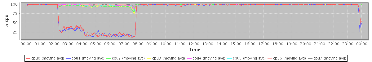 avg(cpu0) = 11.20 avg(cpu1) = 12.01 avg(cpu2) = 0.61 avg(cpu3) = 0.58 avg(cpu4) = 0.27 avg(cpu5) = 0.28 avg(cpu6) = 0.08 avg(cpu7) = 0.09