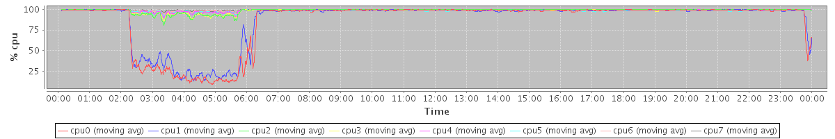 avg(cpu0) = 85.88 avg(cpu1) = 87.19 avg(cpu2) = 98.74 avg(cpu3) = 98.74 avg(cpu4) = 99.28 avg(cpu5) = 99.08 avg(cpu6) = 99.55 avg(cpu7) = 99.69
