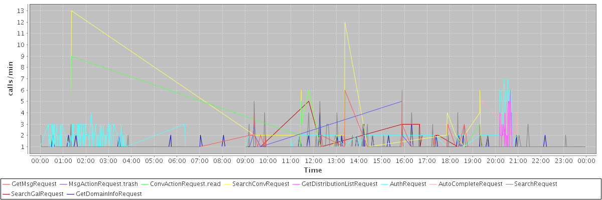 max(GetMsgRequest) = 6.00 max(MsgActionRequest.trash) = 5.00 max(ConvActionRequest.read) = 9.00 max(SearchConvRequest) = 13.00 max(GetDistributionListRequest) = 6.00 max(AuthRequest) = 7.00 max(AutoCompleteRequest) = 5.00 max(SearchRequest) = 5.00 max(SearchGalRequest) = 5.00 max(GetDomainInfoRequest) = 4.00