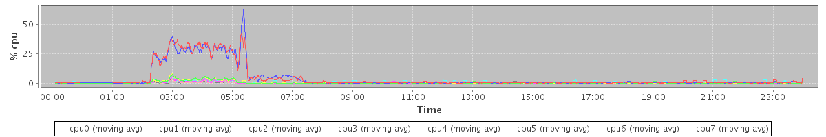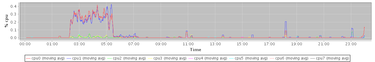 avg(cpu0) = 10.14 avg(cpu1) = 10.57 avg(cpu2) = 0.49 avg(cpu3) = 0.47 avg(cpu4) = 0.25 avg(cpu5) = 0.23 avg(cpu6) = 0.12 avg(cpu7) = 0.08