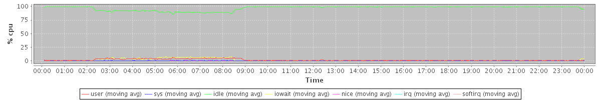 avg(user) = 1.59 avg(sys) = 0.21 avg(idle) = 96.78 avg(iowait) = 1.39 avg(nice) = 0.00 avg(irq) = 0.00 avg(softirq) = 0.00