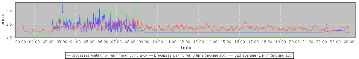 avg(processes waiting for run time) = 1.23 avg(processes waiting for io time) = 0.53 avg(load average (1 min)) = 1.17