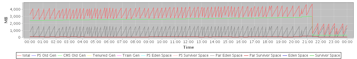 avg(total) = 3281.52 avg(PS Old Gen) = 0.00 avg(CMS Old Gen) = 2379.02 avg(Tenured Gen) = 0.00 avg(Train Gen) = 0.00 avg(PS Eden Space) = 0.00 avg(PS Survivor Space) = 0.00 avg(Par Eden Space) = 813.32 avg(Par Survivor Space) = 89.19 avg(Eden Space) = 0.00 avg(Survivor Space) = 0.00