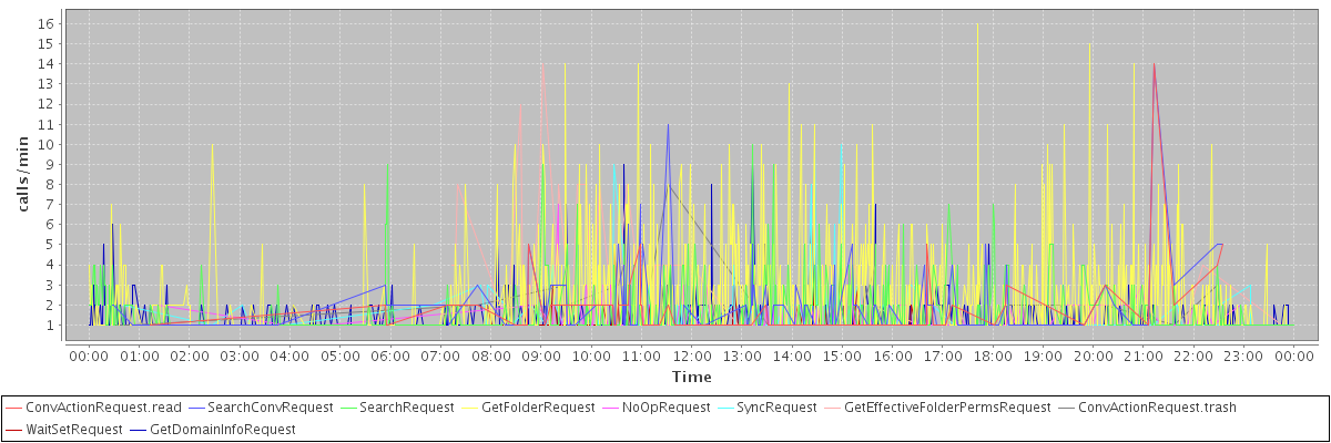 max(ConvActionRequest.read) = 14.00 max(SearchConvRequest) = 14.00 max(SearchRequest) = 10.00 max(GetFolderRequest) = 16.00 max(NoOpRequest) = 7.00 max(SyncRequest) = 10.00 max(GetEffectiveFolderPermsRequest) = 14.00 max(ConvActionRequest.trash) = 8.00 max(WaitSetRequest) = 8.00 max(GetDomainInfoRequest) = 9.00