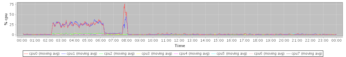 avg(cpu0) = 5.83 avg(cpu1) = 5.57 avg(cpu2) = 0.49 avg(cpu3) = 0.56 avg(cpu4) = 0.27 avg(cpu5) = 0.30 avg(cpu6) = 0.23 avg(cpu7) = 0.13