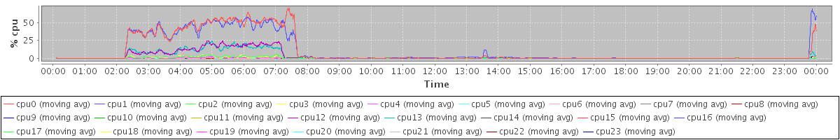 avg(cpu0) = 7.21 avg(cpu1) = 7.06 avg(cpu2) = 0.84 avg(cpu3) = 0.83 avg(cpu4) = 0.61 avg(cpu5) = 0.44 avg(cpu6) = 0.27 avg(cpu7) = 0.32 avg(cpu8) = 0.18 avg(cpu9) = 0.19 avg(cpu10) = 0.13 avg(cpu11) = 0.14 avg(cpu12) = 1.35 avg(cpu13) = 1.28 avg(cpu14) = 2.50 avg(cpu15) = 2.56 avg(cpu16) = 0.97 avg(cpu17) = 1.13 avg(cpu18) = 0.36 avg(cpu19) = 0.38 avg(cpu20) = 0.18 avg(cpu21) = 0.28 avg(cpu22) = 0.10 avg(cpu23) = 0.19