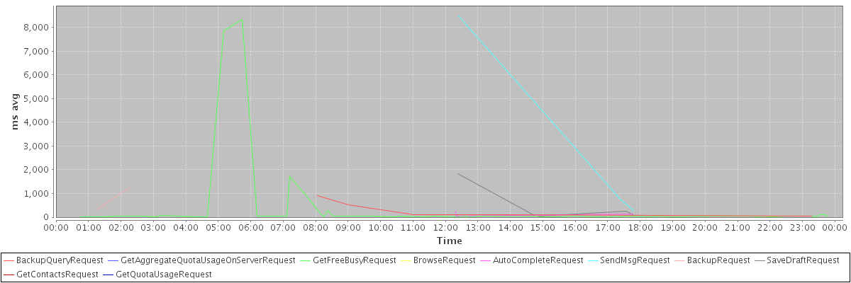 avg(BackupQueryRequest) = 342.80 avg(GetAggregateQuotaUsageOnServerRequest) = 1041.00 avg(GetFreeBusyRequest) = 283.30 avg(BrowseRequest) = 176.00 avg(AutoCompleteRequest) = 101.50 avg(SendMsgRequest) = 3157.00 avg(BackupRequest) = 769.00 avg(SaveDraftRequest) = 326.71 avg(GetContactsRequest) = 61.00 avg(GetQuotaUsageRequest) = 1389.00