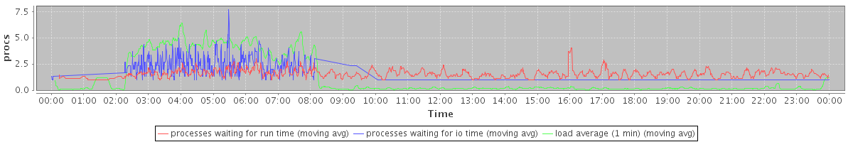 avg(processes waiting for run time) = 0.81 avg(processes waiting for io time) = 0.53 avg(load average (1 min)) = 1.18