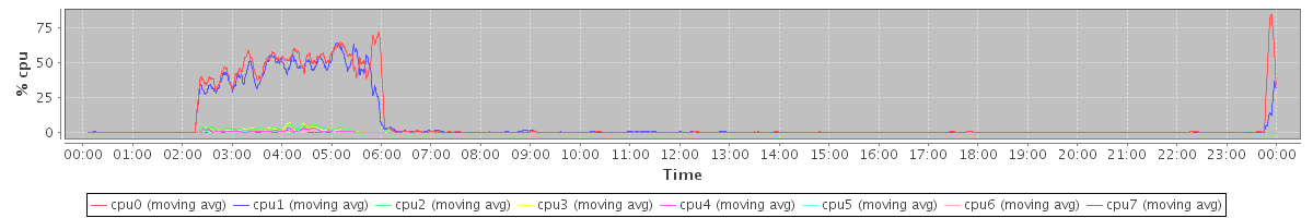 avg(cpu0) = 4.72 avg(cpu1) = 4.43 avg(cpu2) = 0.53 avg(cpu3) = 0.50 avg(cpu4) = 0.30 avg(cpu5) = 0.60 avg(cpu6) = 0.18 avg(cpu7) = 0.13