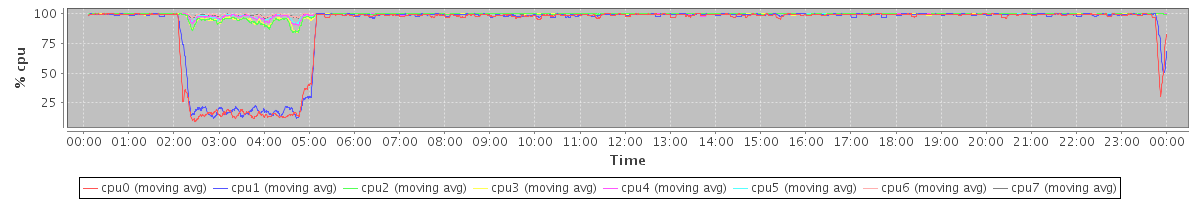 avg(cpu0) = 88.36 avg(cpu1) = 89.03 avg(cpu2) = 98.95 avg(cpu3) = 99.00 avg(cpu4) = 99.30 avg(cpu5) = 99.50 avg(cpu6) = 99.71 avg(cpu7) = 99.63