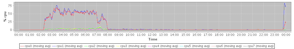 avg(cpu0) = 6.74 avg(cpu1) = 7.23 avg(cpu2) = 0.75 avg(cpu3) = 0.75 avg(cpu4) = 0.37 avg(cpu5) = 0.44 avg(cpu6) = 0.29 avg(cpu7) = 0.20