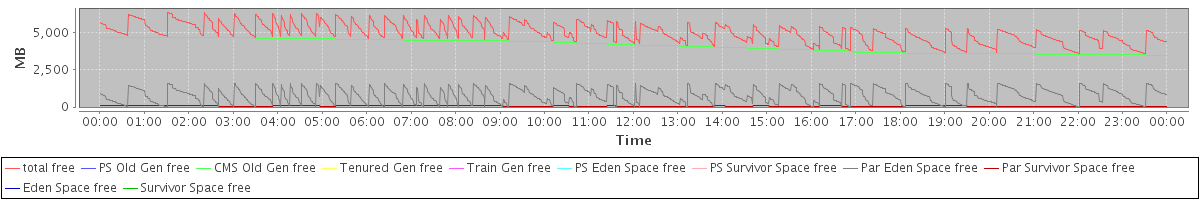 avg(total free) = 4988.45 avg(PS Old Gen free) = 0.00 avg(CMS Old Gen free) = 4130.36 avg(Tenured Gen free) = 0.00 avg(Train Gen free) = 0.00 avg(PS Eden Space free) = 0.00 avg(PS Survivor Space free) = 0.00 avg(Par Eden Space free) = 794.07 avg(Par Survivor Space free) = 64.03 avg(Eden Space free) = 0.00 avg(Survivor Space free) = 0.00