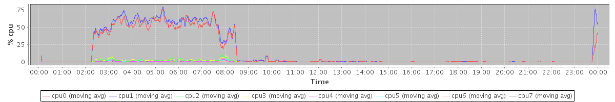 avg(cpu0) = 6.59 avg(cpu1) = 6.91 avg(cpu2) = 0.70 avg(cpu3) = 0.71 avg(cpu4) = 0.34 avg(cpu5) = 0.40 avg(cpu6) = 0.27 avg(cpu7) = 0.20