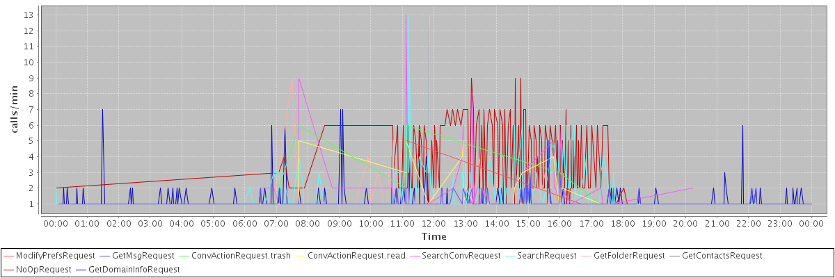 max(ModifyPrefsRequest) = 5.00 max(GetMsgRequest) = 5.00 max(ConvActionRequest.trash) = 6.00 max(ConvActionRequest.read) = 5.00 max(SearchConvRequest) = 13.00 max(SearchRequest) = 13.00 max(GetFolderRequest) = 9.00 max(GetContactsRequest) = 5.00 max(NoOpRequest) = 9.00 max(GetDomainInfoRequest) = 13.00