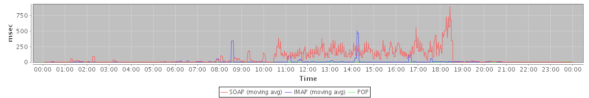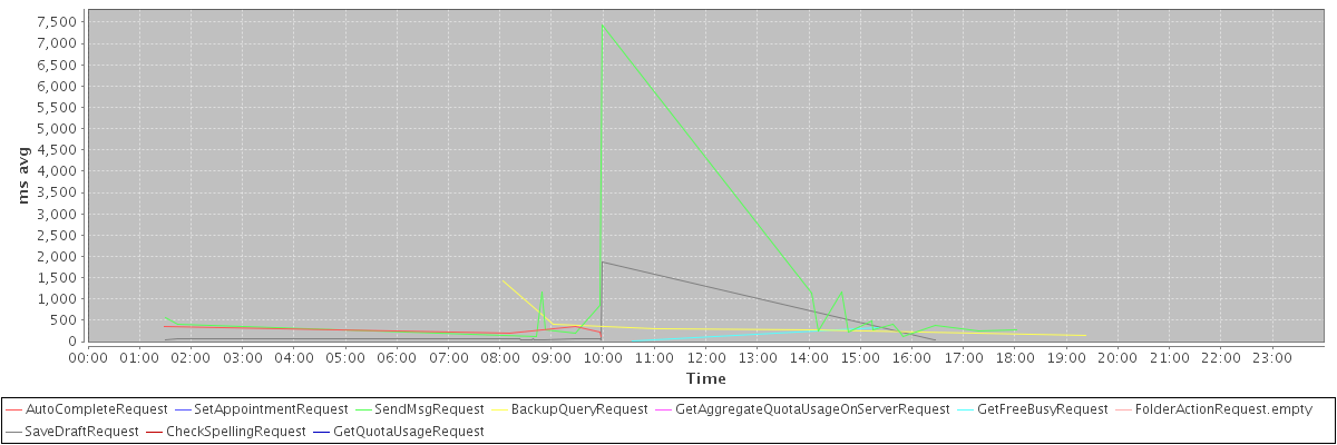 avg(AutoCompleteRequest) = 246.80 avg(SetAppointmentRequest) = 1919.00 avg(SendMsgRequest) = 811.35 avg(BackupQueryRequest) = 505.80 avg(GetAggregateQuotaUsageOnServerRequest) = 823.00 avg(GetFreeBusyRequest) = 111.33 avg(FolderActionRequest.empty) = 983.00 avg(SaveDraftRequest) = 103.16 avg(CheckSpellingRequest) = 1345.00 avg(GetQuotaUsageRequest) = 913.00