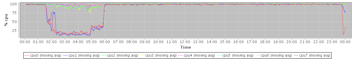 avg(cpu0) = 9.58 avg(cpu1) = 8.89 avg(cpu2) = 0.65 avg(cpu3) = 0.71 avg(cpu4) = 0.31 avg(cpu5) = 0.38 avg(cpu6) = 0.10 avg(cpu7) = 0.12