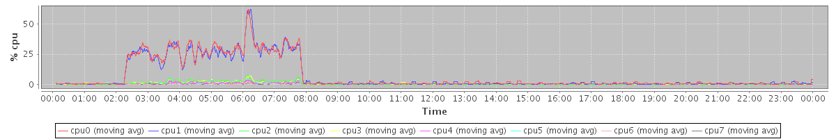 avg(cpu0) = 7.35 avg(cpu1) = 7.11 avg(cpu2) = 0.76 avg(cpu3) = 0.78 avg(cpu4) = 0.41 avg(cpu5) = 0.63 avg(cpu6) = 0.21 avg(cpu7) = 0.20