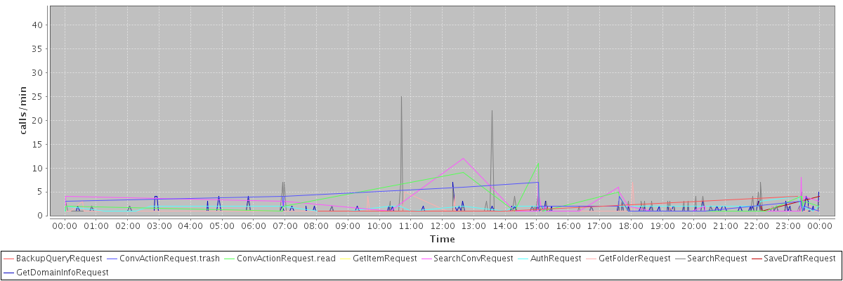 max(BackupQueryRequest) = 4.00 max(ConvActionRequest.trash) = 7.00 max(ConvActionRequest.read) = 11.00 max(GetItemRequest) = 42.00 max(SearchConvRequest) = 12.00 max(AuthRequest) = 4.00 max(GetFolderRequest) = 7.00 max(SearchRequest) = 25.00 max(SaveDraftRequest) = 4.00 max(GetDomainInfoRequest) = 7.00