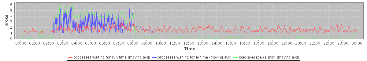 avg(processes waiting for run time) = 0.90 avg(processes waiting for io time) = 0.60 avg(load average (1 min)) = 1.14
