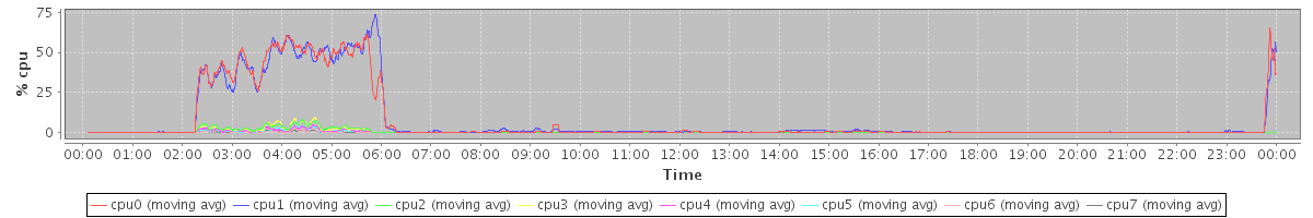 avg(cpu0) = 5.21 avg(cpu1) = 4.99 avg(cpu2) = 0.58 avg(cpu3) = 0.58 avg(cpu4) = 0.35 avg(cpu5) = 0.64 avg(cpu6) = 0.17 avg(cpu7) = 0.18