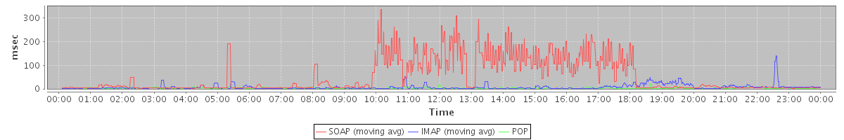 avg(SetAppointmentRequest) = 94.00 avg(AutoCompleteRequest) = 185.50 avg(SendMsgRequest) = 354.14 avg(GetContactsRequest) = 53.33 avg(SearchGalRequest) = 50.22 avg(BackupQueryRequest) = 563.00 avg(GetAggregateQuotaUsageOnServerRequest) = 789.00 avg(WaitSetRequest) = 84.17 avg(SaveDraftRequest) = 44.69 avg(GetQuotaUsageRequest) = 913.00