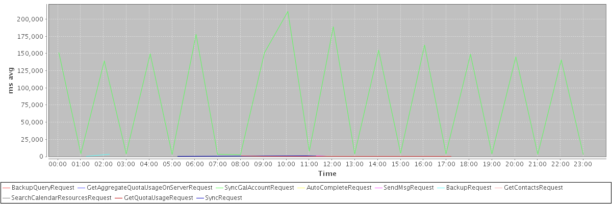 avg(BackupQueryRequest) = 290.20 avg(GetAggregateQuotaUsageOnServerRequest) = 1076.00 avg(SyncGalAccountRequest) = 82115.62 avg(AutoCompleteRequest) = 1031.00 avg(SendMsgRequest) = 613.00 avg(BackupRequest) = 1976.00 avg(GetContactsRequest) = 171.00 avg(SearchCalendarResourcesRequest) = 108.00 avg(GetQuotaUsageRequest) = 1389.00 avg(SyncRequest) = 93.17