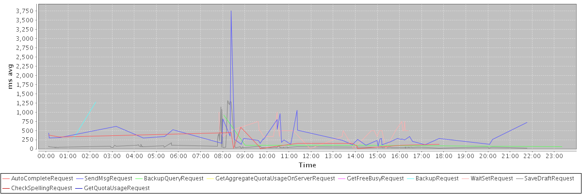 avg(AutoCompleteRequest) = 185.31 avg(SendMsgRequest) = 396.81 avg(BackupQueryRequest) = 255.00 avg(GetAggregateQuotaUsageOnServerRequest) = 1064.00 avg(GetFreeBusyRequest) = 2871.00 avg(BackupRequest) = 783.00 avg(WaitSetRequest) = 146.51 avg(SaveDraftRequest) = 160.47 avg(CheckSpellingRequest) = 206.00 avg(GetQuotaUsageRequest) = 1129.00