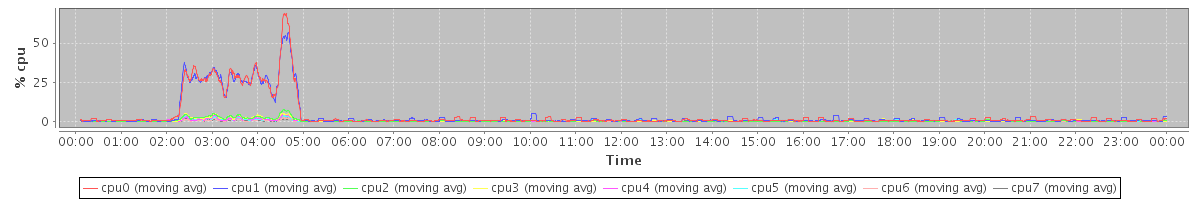 avg(cpu0) = 4.00 avg(cpu1) = 3.94 avg(cpu2) = 0.52 avg(cpu3) = 0.48 avg(cpu4) = 0.31 avg(cpu5) = 0.31 avg(cpu6) = 0.14 avg(cpu7) = 0.26