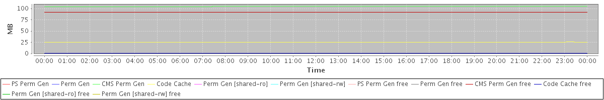 avg(PS Perm Gen) = 0.00 avg(Perm Gen) = 0.00 avg(CMS Perm Gen) = 104.63 avg(Code Cache) = 25.25 avg(Perm Gen [shared-ro]) = 0.00 avg(Perm Gen [shared-rw]) = 0.00 avg(PS Perm Gen free) = 0.00 avg(Perm Gen free) = 0.00 avg(CMS Perm Gen free) = 91.37 avg(Code Cache free) = 0.29 avg(Perm Gen [shared-ro] free) = 0.00 avg(Perm Gen [shared-rw] free) = 0.00