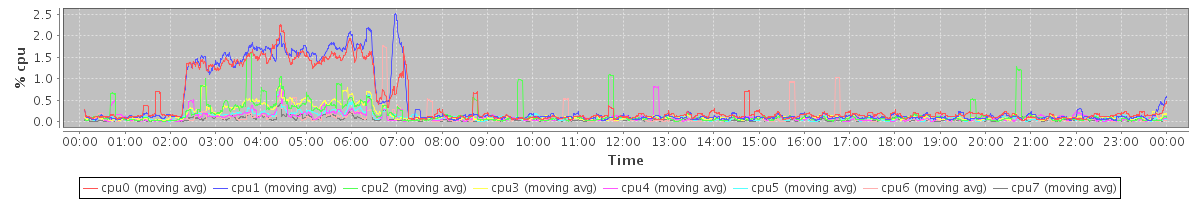 avg(cpu0) = 5.20 avg(cpu1) = 5.79 avg(cpu2) = 0.52 avg(cpu3) = 0.52 avg(cpu4) = 0.27 avg(cpu5) = 0.28 avg(cpu6) = 0.24 avg(cpu7) = 0.14