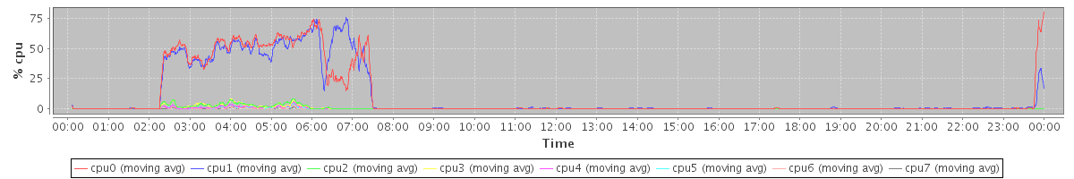 avg(cpu0) = 11.49 avg(cpu1) = 11.21 avg(cpu2) = 0.56 avg(cpu3) = 0.50 avg(cpu4) = 0.24 avg(cpu5) = 0.21 avg(cpu6) = 0.09 avg(cpu7) = 0.07