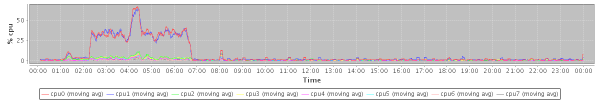 avg(cpu0) = 10.10 avg(cpu1) = 9.83 avg(cpu2) = 0.72 avg(cpu3) = 0.69 avg(cpu4) = 0.36 avg(cpu5) = 0.34 avg(cpu6) = 0.15 avg(cpu7) = 0.13