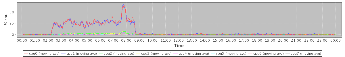 avg(cpu0) = 8.08 avg(cpu1) = 7.80 avg(cpu2) = 0.78 avg(cpu3) = 0.72 avg(cpu4) = 0.43 avg(cpu5) = 0.45 avg(cpu6) = 0.32 avg(cpu7) = 0.20