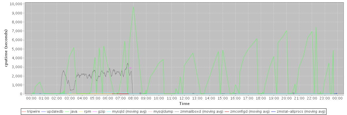 avg(tripwire) = 2165.00 avg(updatedb) = 40.04 avg(java) = 1000.19 avg(rpm) = 13.75 avg(gzip) = 2893.64 avg(mysqld) = 26.56 avg(mysqldump) = 140.19 avg(zmmailboxd) = 502.48 avg(zmconfigd) = 5.70 avg(zmstat-allprocs) = 11.08