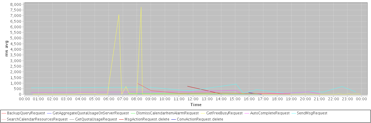 avg(BackupQueryRequest) = 284.33 avg(GetAggregateQuotaUsageOnServerRequest) = 854.00 avg(DismissCalendarItemAlarmRequest) = 59.50 avg(GetFreeBusyRequest) = 202.20 avg(AutoCompleteRequest) = 154.33 avg(SendMsgRequest) = 408.55 avg(SearchCalendarResourcesRequest) = 284.00 avg(GetQuotaUsageRequest) = 1020.00 avg(MsgActionRequest.delete) = 383.00 avg(ConvActionRequest.delete) = 79.00