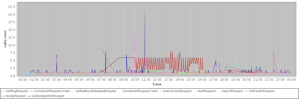 max(GetMsgRequest) = 8.00 max(ConvActionRequest.trash) = 4.00 max(SetMailboxMetadataRequest) = 4.00 max(ConvActionRequest.read) = 8.00 max(SearchConvRequest) = 13.00 max(AuthRequest) = 4.00 max(SearchRequest) = 23.00 max(GetFolderRequest) = 9.00 max(NoOpRequest) = 8.00 max(GetDomainInfoRequest) = 23.00