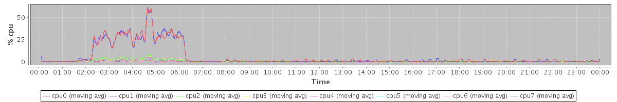 avg(cpu0) = 0.43 avg(cpu1) = 0.38 avg(cpu2) = 0.15 avg(cpu3) = 0.12 avg(cpu4) = 0.11 avg(cpu5) = 0.07 avg(cpu6) = 0.06 avg(cpu7) = 0.05