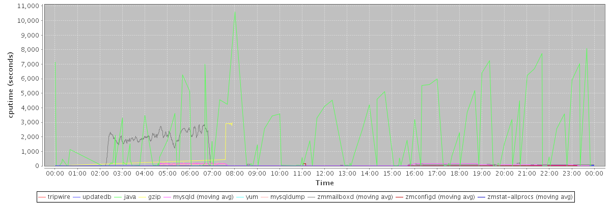 avg(tripwire) = 1825.00 avg(updatedb) = 23.44 avg(java) = 1127.24 avg(gzip) = 2766.08 avg(mysqld) = 56.11 avg(yum) = 39.77 avg(mysqldump) = 135.77 avg(zmmailboxd) = 433.38 avg(zmconfigd) = 6.79 avg(zmstat-allprocs) = 11.56