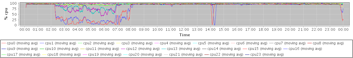 avg(cpu0) = 0.44 avg(cpu1) = 0.44 avg(cpu2) = 0.14 avg(cpu3) = 0.17 avg(cpu4) = 0.09 avg(cpu5) = 0.12 avg(cpu6) = 0.06 avg(cpu7) = 0.09 avg(cpu8) = 0.05 avg(cpu9) = 0.04 avg(cpu10) = 0.09 avg(cpu11) = 0.06 avg(cpu12) = 0.18 avg(cpu13) = 0.19 avg(cpu14) = 0.43 avg(cpu15) = 0.45 avg(cpu16) = 0.14 avg(cpu17) = 0.19 avg(cpu18) = 0.05 avg(cpu19) = 0.06 avg(cpu20) = 0.06 avg(cpu21) = 0.06 avg(cpu22) = 0.05 avg(cpu23) = 0.07