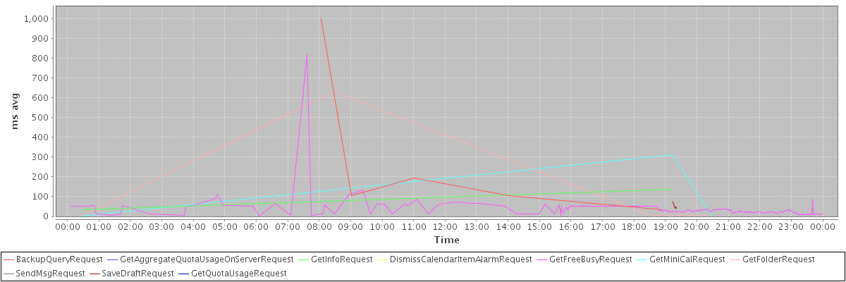 avg(BackupQueryRequest) = 288.60 avg(GetAggregateQuotaUsageOnServerRequest) = 867.00 avg(GetInfoRequest) = 86.00 avg(DismissCalendarItemAlarmRequest) = 23.00 avg(GetFreeBusyRequest) = 36.34 avg(GetMiniCalRequest) = 105.33 avg(GetFolderRequest) = 81.00 avg(SendMsgRequest) = 575.00 avg(SaveDraftRequest) = 51.00 avg(GetQuotaUsageRequest) = 1017.00